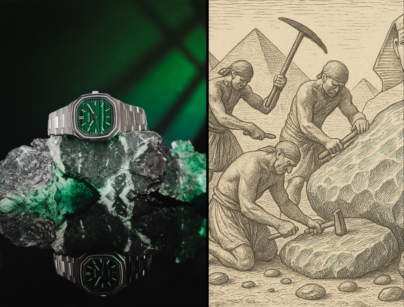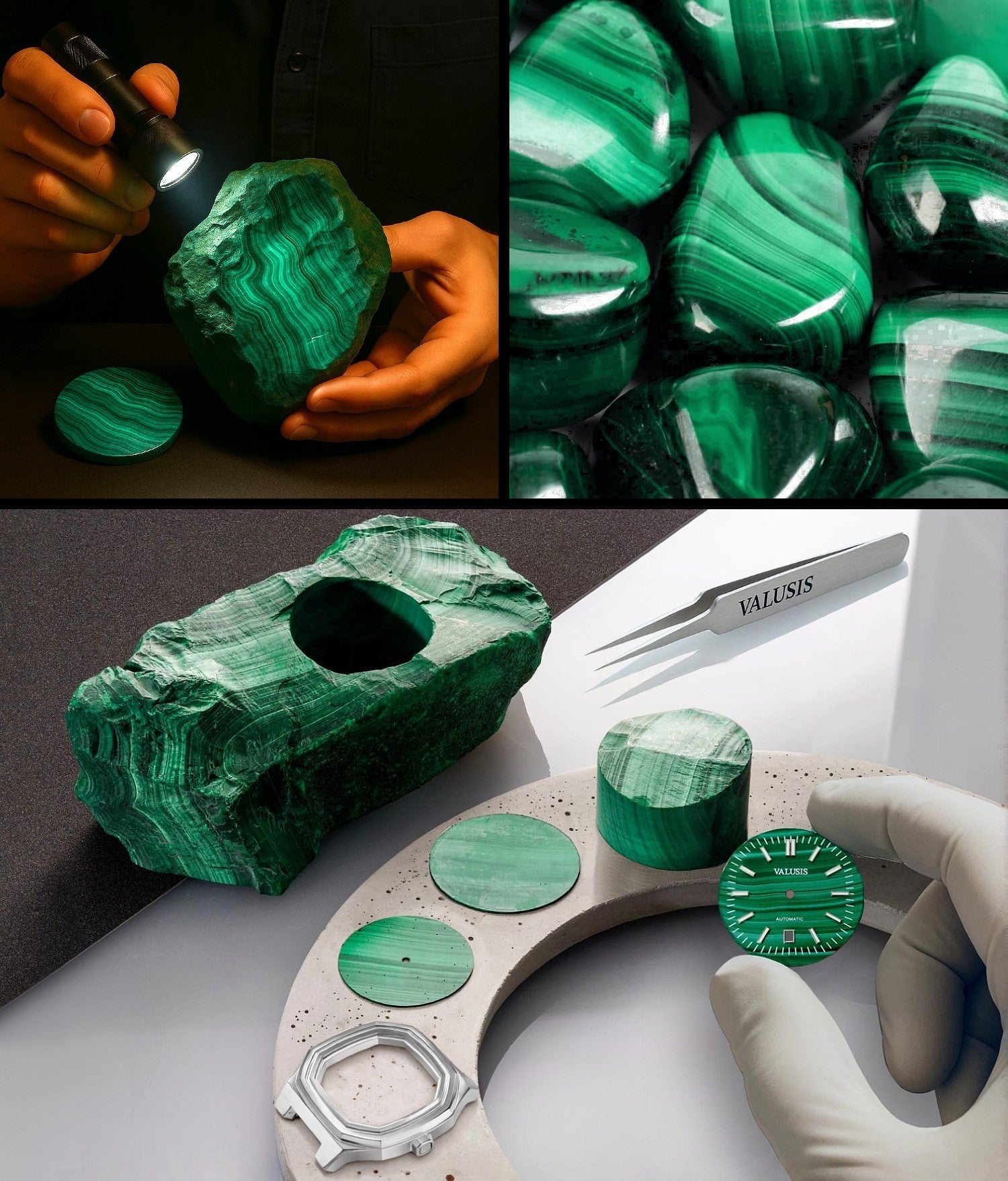 VALUSIS Malachite dial begins its journey deep within the EARTH's crust. It is a green mineral formed naturally in copper-rich regions of the world.