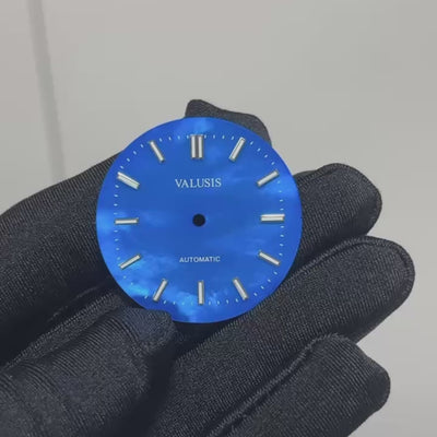 VALUSIS Mother-of-pearl dial is harvested from the inner shell layers of rare oysters.The raw material is meticulously polished to achieve an uniform surface.The rich blues and natural reflections captured within each dial is special for every watch.